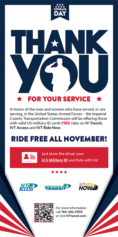 In honor of the men and women who have served, or are serving, in the United States Armed Forces - the Imperial County Transporation Commission will be offering those with valid US military ID cards FREE rides on IV Transit, IVT Access, and IVT Ride Now.